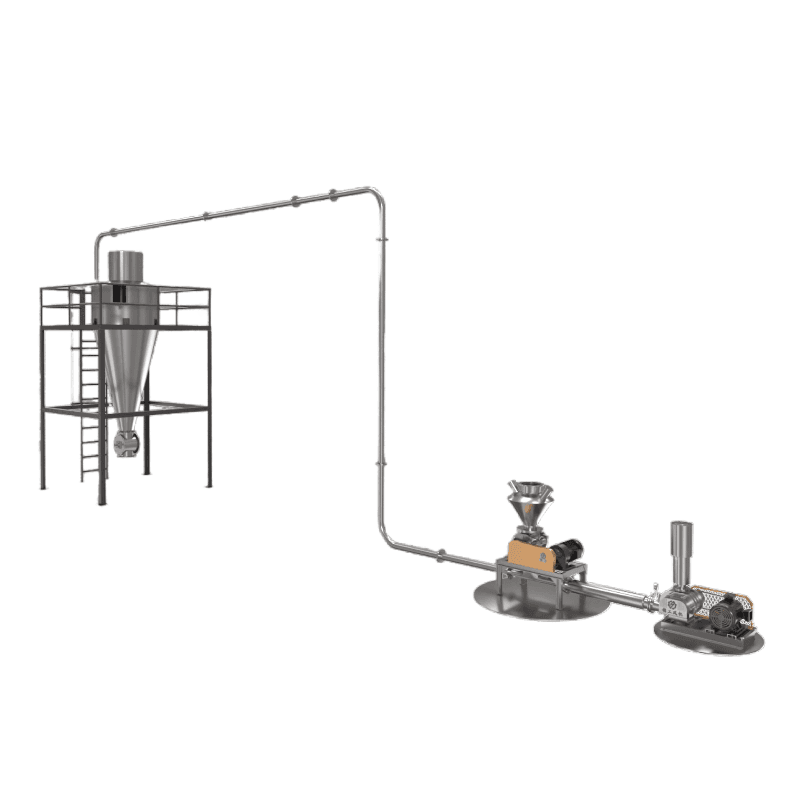 當(dāng)輸送管路內(nèi)氣體壓力高于大氣壓時(shí),稱為壓送式氣力輸送。即風(fēng)機(jī)將壓縮空氣輸入供料器內(nèi),使物料與氣體混合,混合的氣料經(jīng)輸送管道進(jìn)入分離器。在分離器內(nèi),物料和氣體分離,物料由分離器底部卸出,氣體經(jīng)除塵器除塵后排放到大氣中。